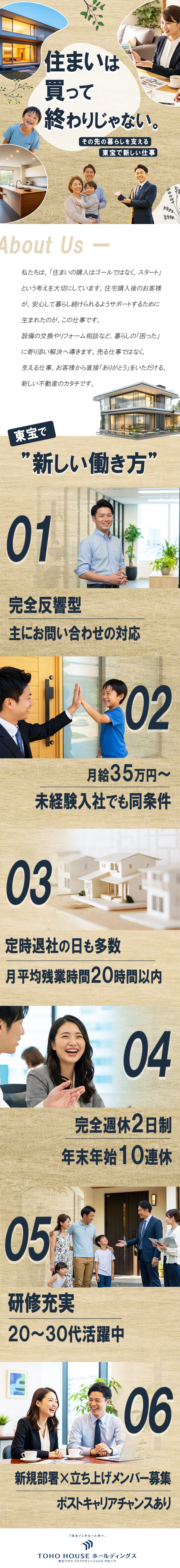 東宝ハウスグループは「住まいの購入はゴールではなく、スタート」という考えを大切にしています。従来、住宅購入後のアフターサポートは別会社が担当するのが一般的でした。しかし、お客様の人生に本気で寄り添うためには、購入後こそ手厚いサポートが必要だと考え、グループ内に専門部署を新設しました。