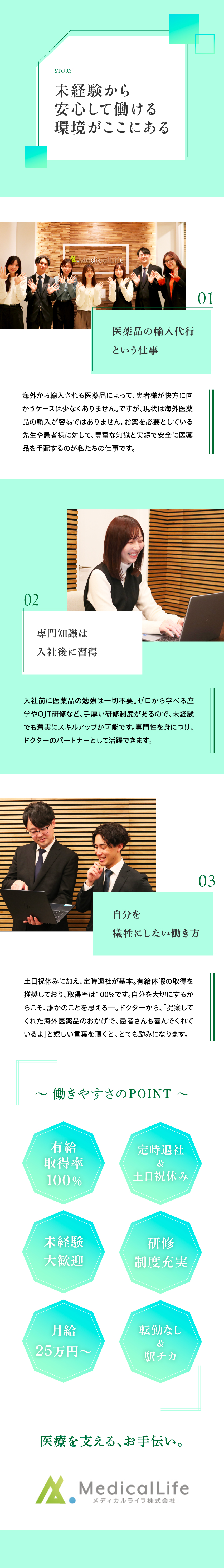 知識が増えていくのが目に見えて分かるので、専門性が高まる程、出来なかったことが出来るようになる喜びを感じられます。ドクターとの信頼関係を築けると、海外医薬品について相談される機会が増えたり、知り合いのクリニックを紹介してもらえるなど、さらにやりがいを実感!あなたも会社もクリニックも、一緒に成長していくことができる環境です。