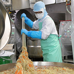 ▼調理課:機械作業を中心とした野菜加工(皮むき、肉などのカット作業)、大釜での惣菜調理、フライヤーによる焼き物、揚げ物調理等