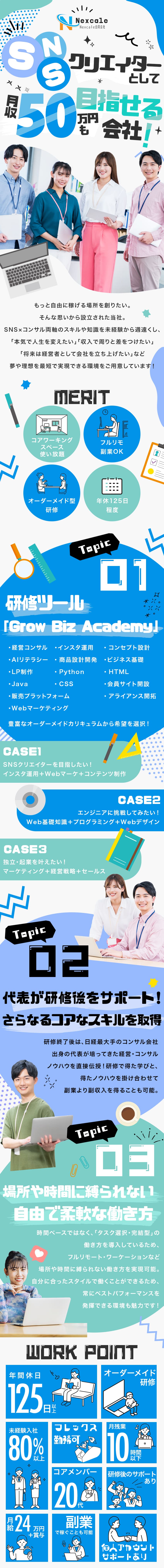 「誰かに指示されて働く」のではなく、「自分の人生を自分でコントロールする」感覚で働けることが最大のやりがい。SNSクリエイターとしてのノウハウ習得や実務経験を経て、希望次第で新規事業責任者、経営参画も可能。スキルを磨くほど副収入が増え、働く時間や場所にも縛られず、将来的な独立・起業を視野に入れたオリジナリティの高いキャリア設計ができる点も魅力です 。