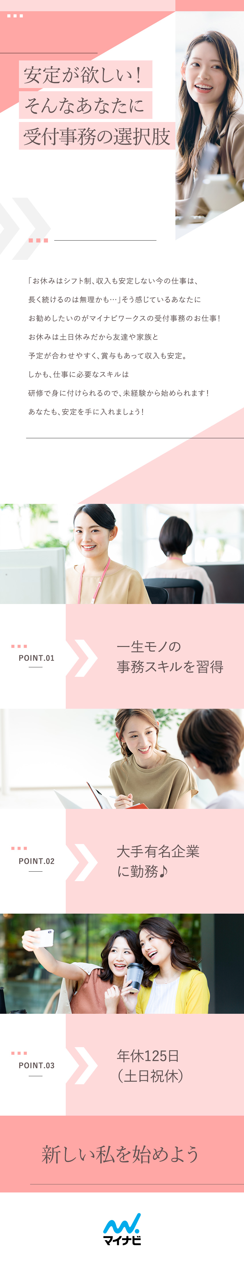 未経験からスタートできる受付事務アシスタント!◇充実の研修体制◇残業ほぼなし/年休125日