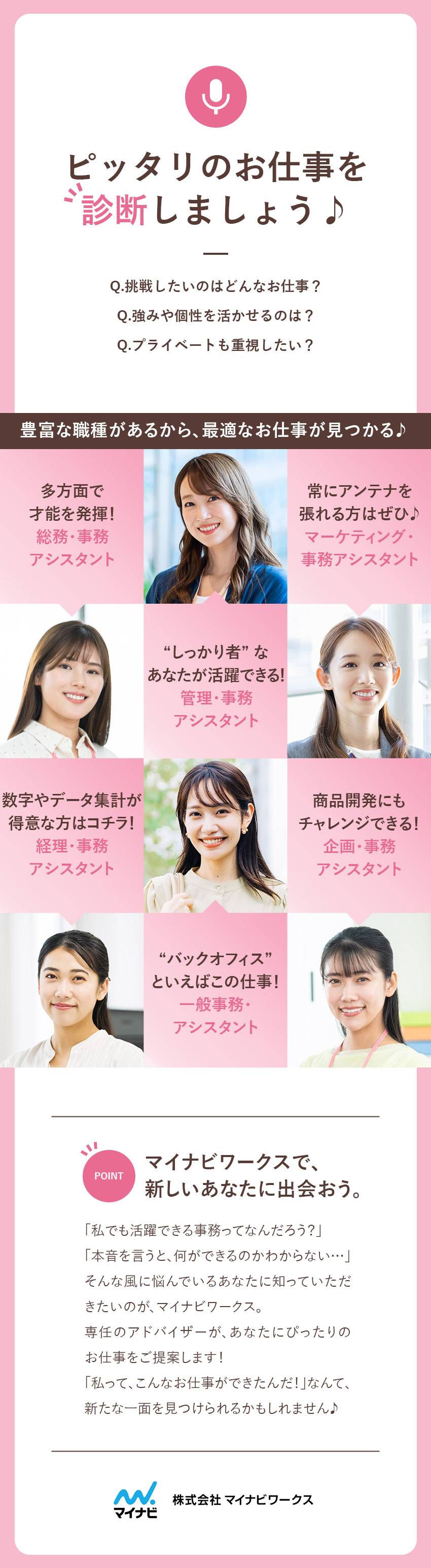 お仕事面についても、専任のアドバイザーが、多彩な選択肢からピッタリのお仕事を紹介してくれるので安心。「私に合う事務って…?」などと、まだご自身の強みを発見できていない方も、安心して始められる体制が整っています!