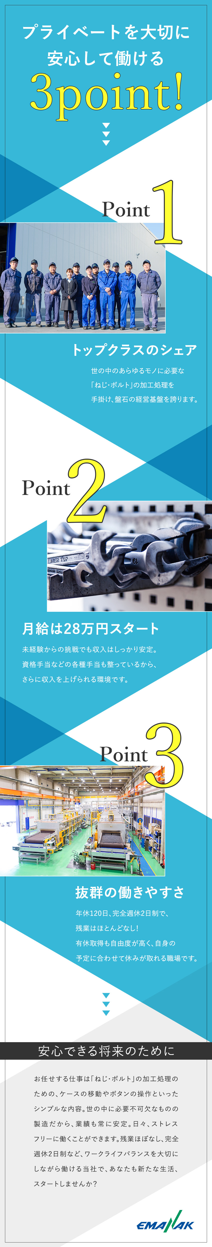 【残業ほぼなし】未経験OK!ねじやボルトの熱処理加工★ケースの移動とボタン操作からのカンタン作業