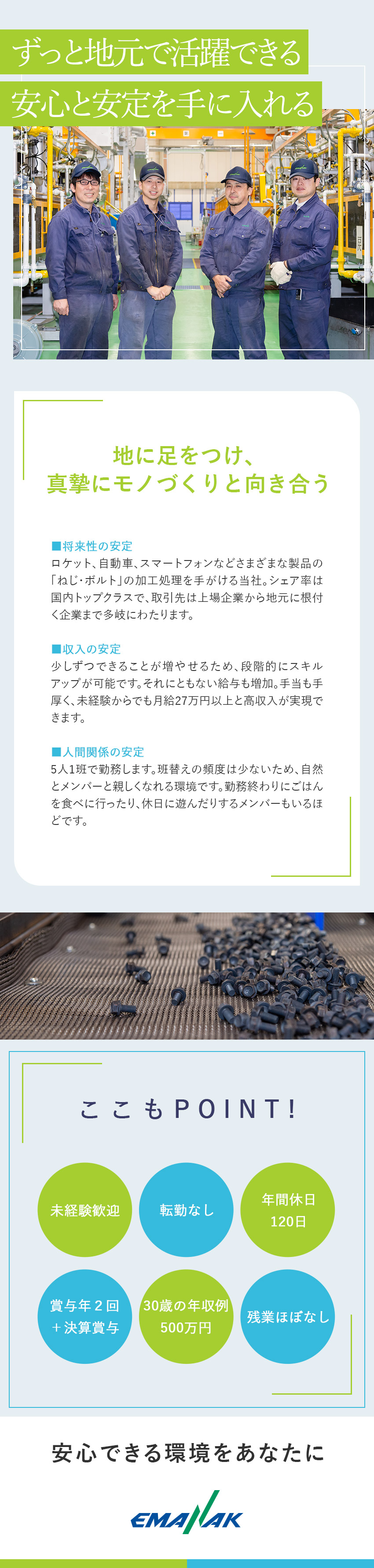 【未経験歓迎】ねじ・ボルトの熱処理加工◆ボタン操作などシンプル業務からスタート◆残業ほぼなし