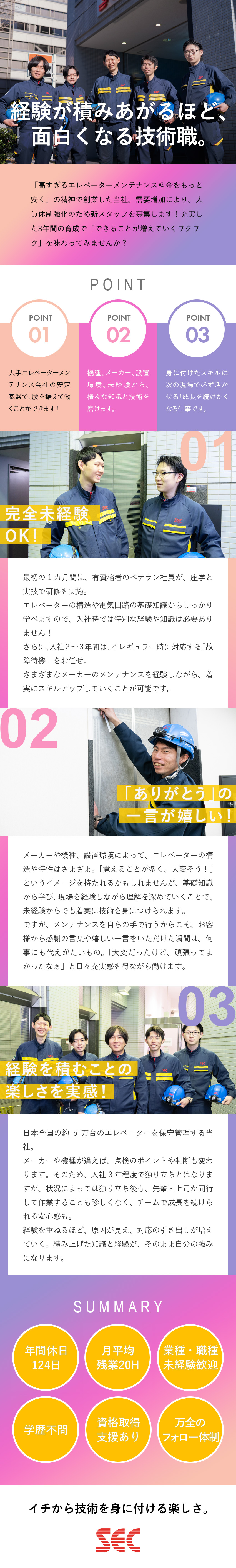 エレベーターのメンテナンススタッフ/未経験歓迎/年休124日