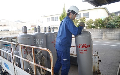 飲食店や個人宅へガスボンベの配送をお任せ!特に夏場は比較的配送数が少なく、時間休を有効に活用中!