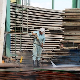 建設現場から戻ってきた鉄板を洗浄、メンテナンスする仕事。最初は簡単な汚れを落とす作業から担当します。