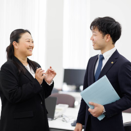 待遇アップ、昇進など成果がしっかりと反映される環境ですが、成果を出すために努力が重要です。一朝一夕で契約を取れるようなものではなく、お客さまに歩み寄り、長期的に関係性を築いていきながら提案を続ける仕事です。そのために法律や規定の勉強はもちろん、お客さまの特徴を鑑みた提案方法など、さまざまな知識を身に付けていく必要があります。