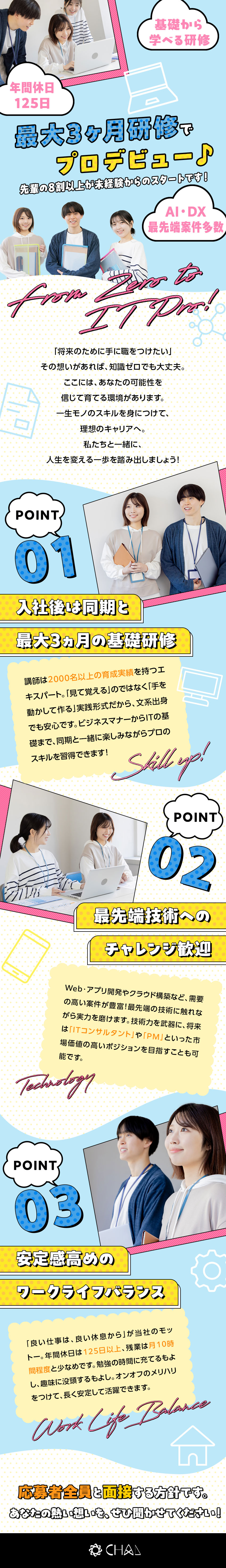 IT業界未経験でも大丈夫。給料をもらいながら、最大3ヶ月の研修で基礎から学べます。年間休日125日、残業は月平均10時間で、ワークライフバランスも◎