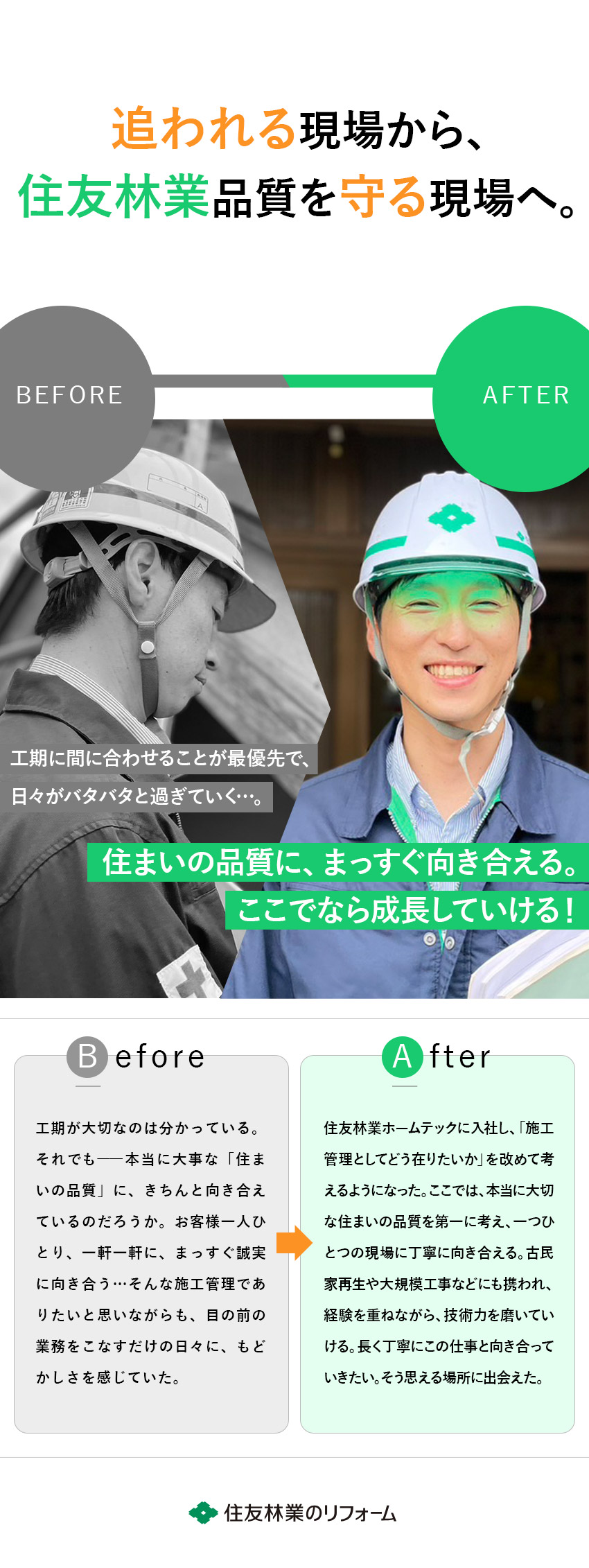 【高松】リフォーム施工管理◆住友林業Gの安定基盤/水日祝休/退職金・エリア限定制度有/出張なし