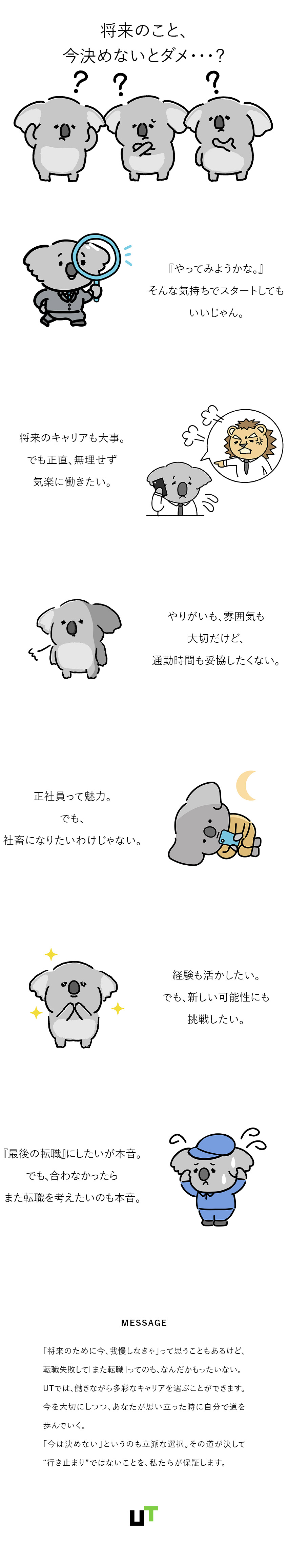 仕事が合うかどうかは働いてみないとわからないものですが、多種多様な働き方ができるUTならば、きっとあなたらしい働き方を見つけられるはずです。