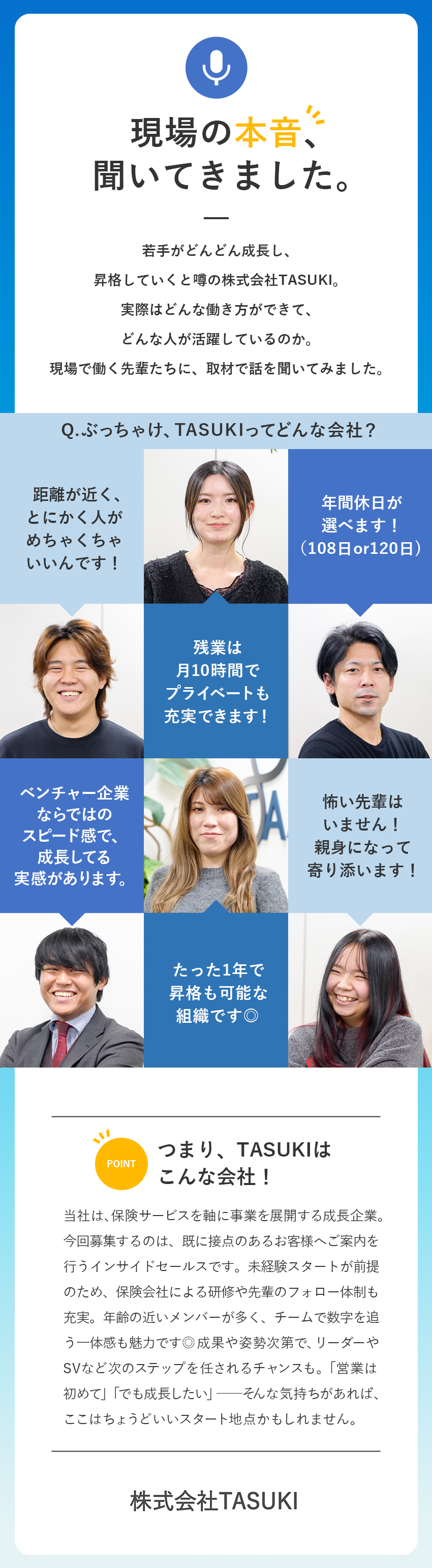 A. TASUKIでは挑戦した分だけ成長でき、成果が役職や給与に反映されやすいと感じたからです。入社当初から「早く責任者を目指したい」と考え、新しい仕事にも積極的に挑戦してきました!
