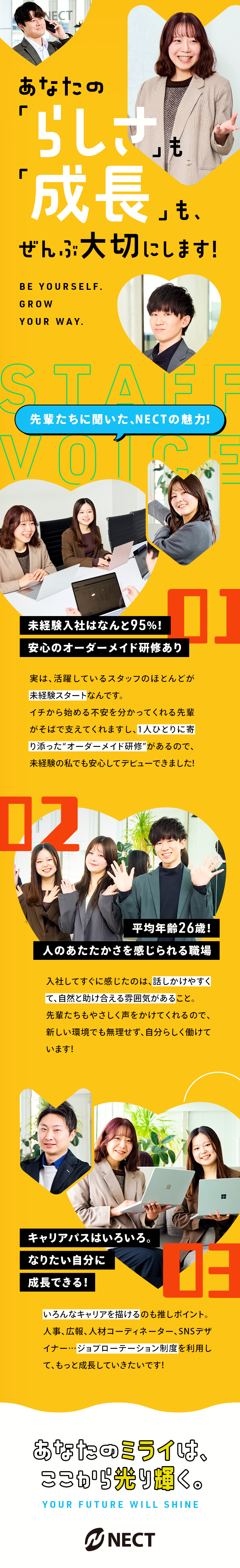 万全な研修制度・フォロー体制が整っていますが、自身のスキルとして身につけていくには積極的に学ぶ姿勢も必要です。未経験からスタートした社員がほとんどなので、困りごとが出た際に相談する姿勢があれば、大きな心配はありません。