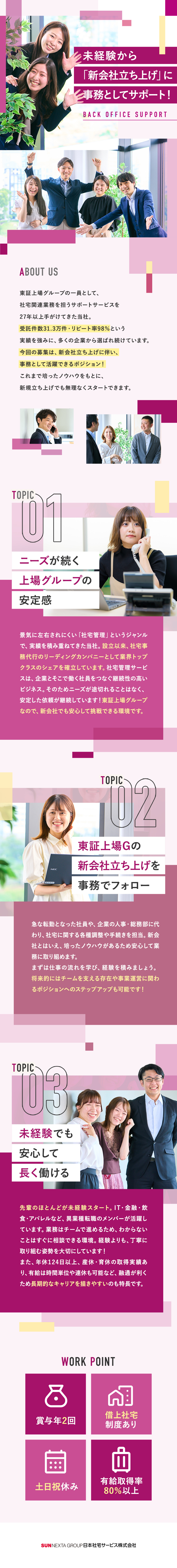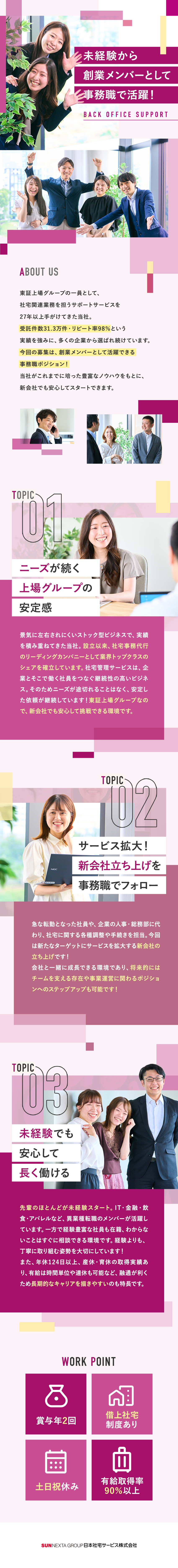 新社での業務ですが、上場Gの安定基盤がある当社。これまでの確かな実績とノウハウがあるため、未経験者や経験が浅い方も安心して業務に取組むことができます!