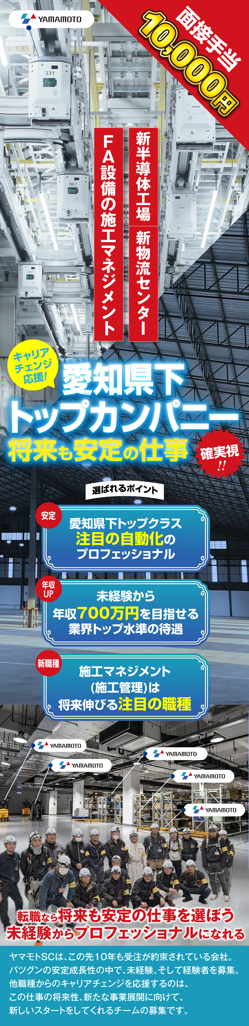 ヤマモトSCは、今注目の半導体工場や物流自動化倉庫の中の設備・機器を設置・据付する施工マネジメント会社。この先10年の受注も確保しているので安定成長中で、年収アップも間違いなしです