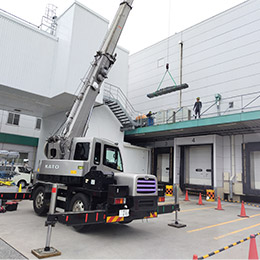 太陽光発電設備を屋根上に運ぶときは、クレーン車を使用しています。