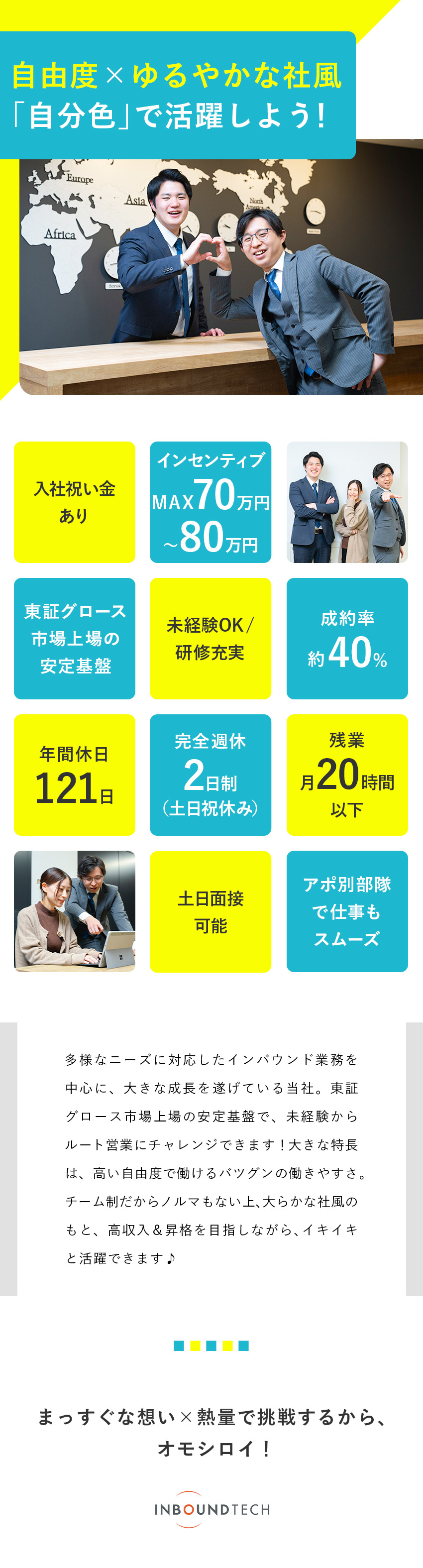 未経験歓迎★手厚い研修で営業デビューを全力サポート/高待遇★月給26万円以上+各種手当+インセンティブ/働き方★土日祝休/残業月20h以下/転居費補助あり/株式会社インバウンドテック【グロース市場】