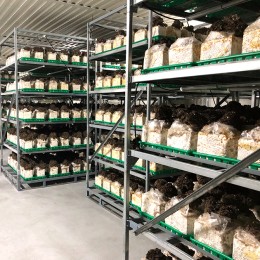 生産工場では、夏と秋、それぞれの季節を再現した部屋で、丹精込めてキノコを栽培しています。