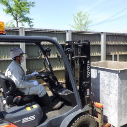 焼却したあとに出た灰や砂が入ったコンテナを、フォークリフトで移動。