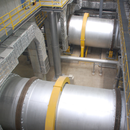 産廃物を焼却するロータリーキルン。直径が5.1m、長さが13.6mある巨大な設備です。