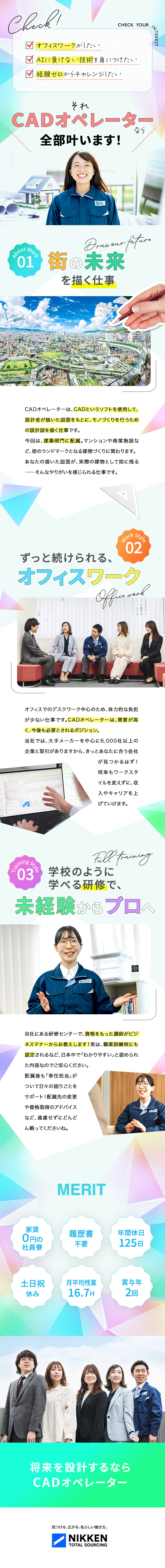 CADオペレーターは、ものをつくるための設計図を描く、ものづくりに欠かせない専門職。同社では文系・理系とわず、未経験からそんな専門スキルが身につけられます。