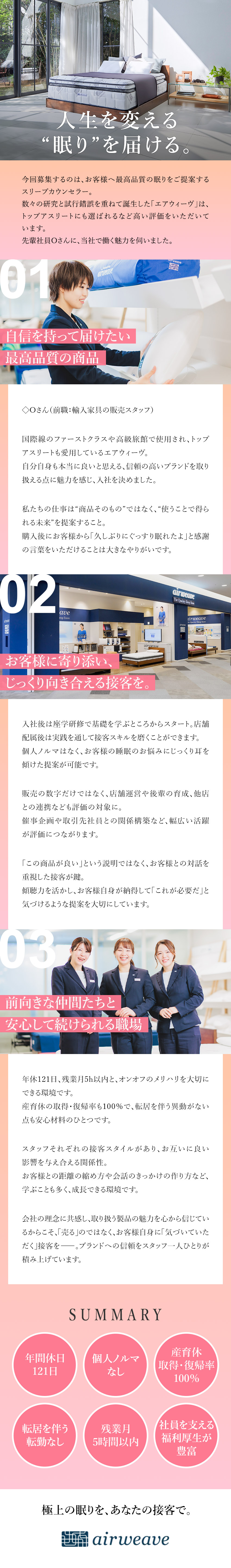 睡眠への悩みや寝具の好みなど、時間をかけてニーズをお聞きした上でご案内ができるため、お客様に寄り添う“質の高い接客スキル”が身につきます。