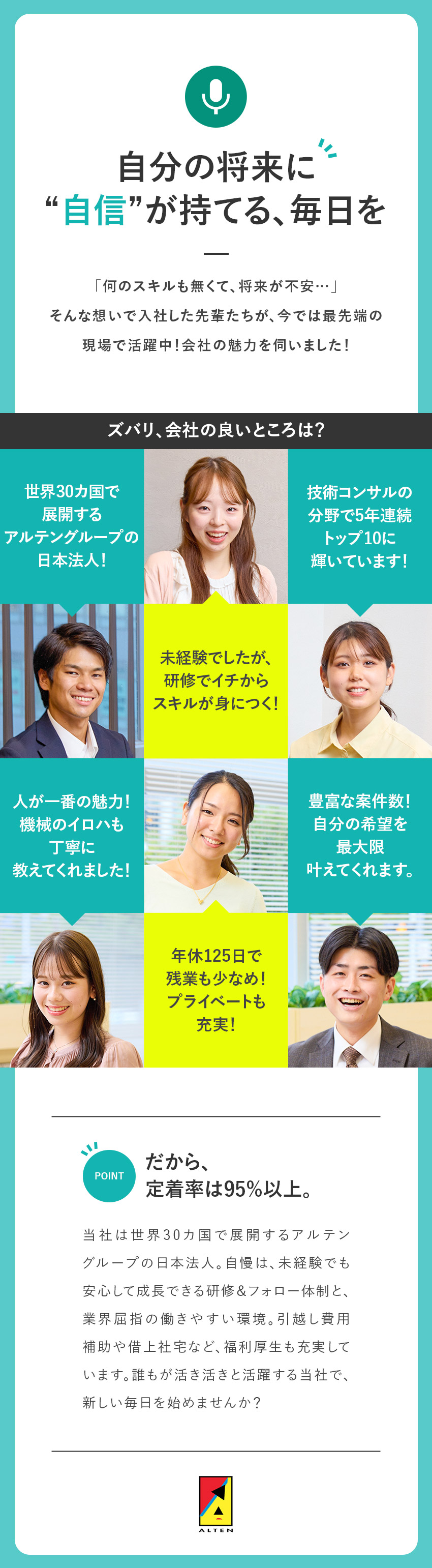 定着率は95%以上!年休125日、平均残業月16.5hなど、働きやすい環境が整っています。