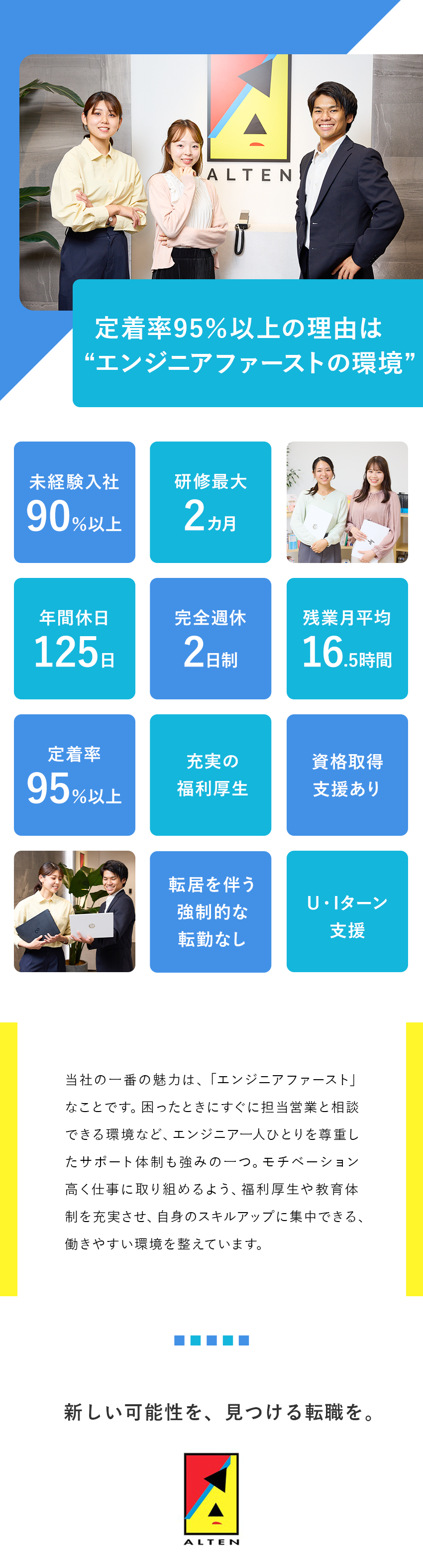 定着率は95%以上!年休125日、平均残業月16.5hなど、働きやすい環境が整っています。
