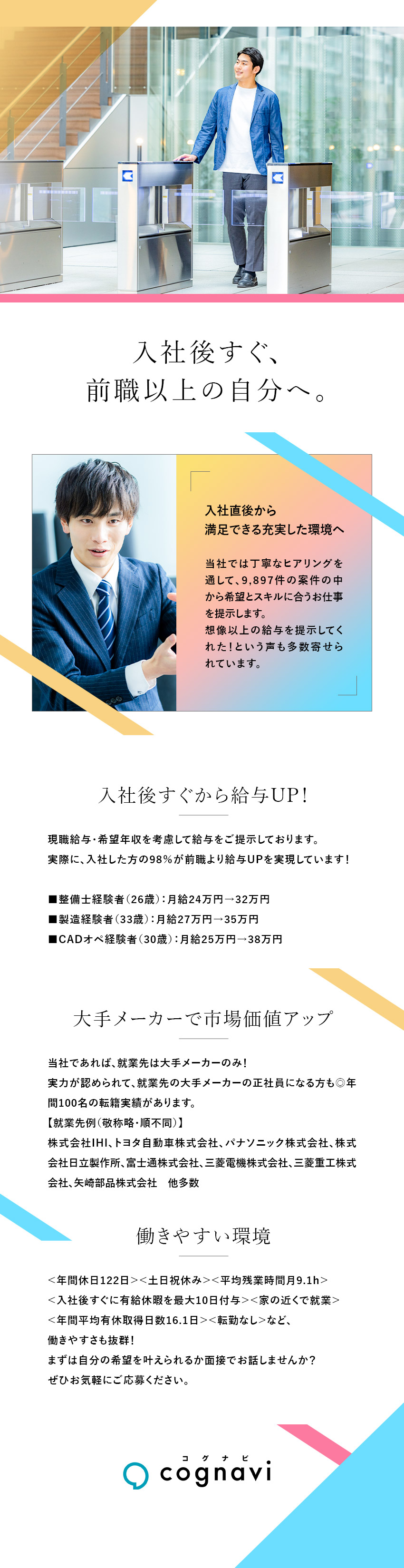 前職経験を活かして給与アップしたいと思い、応募しました。現在は希望通り大手メーカーで自動車内装部品の設計の仕事をしています。給与アップとスキルアップ、両方叶えることができて満足しています。
