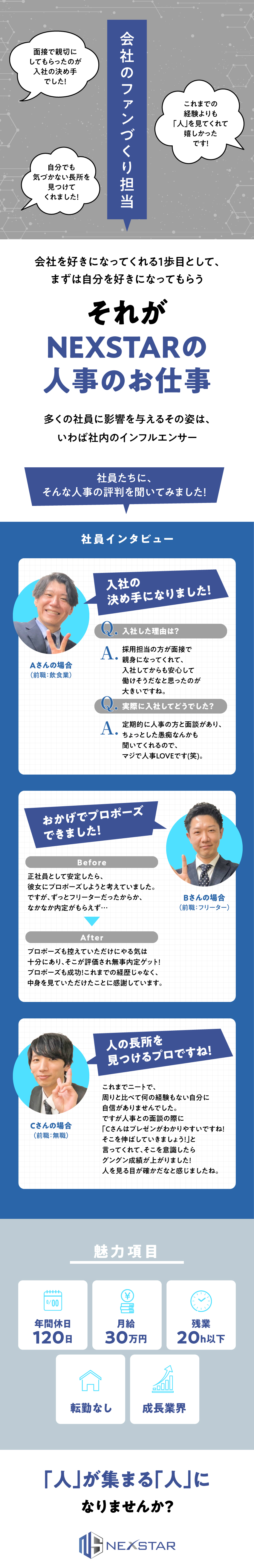 「NEXSTAR」という社名には、「次のスターを創る」という想いが込められているそうです。これまでの経験や経歴にとらわれず誰でもスターになれる可能性を信じている同社だからこそ、入社した社員一人ひとりが輝けるよう働き方は自分で選べるような体制をつくっています。入社後まずは個人の成長スピードに合わせてフォローしているほか、定期的な面談もあり、社員たちが自分らしく活躍できる環境が整っています。