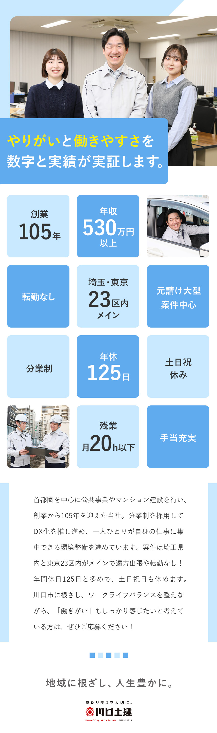 NEW【川口駅:オープンポジション】創業100周年の総合建築会社◆年間休日125日・高定着率◎◆転勤無