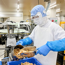 ⇒介護現場や病院で食べられているパック食を作る仕事です。調理・包装・仕分けの各部署に配属となります。