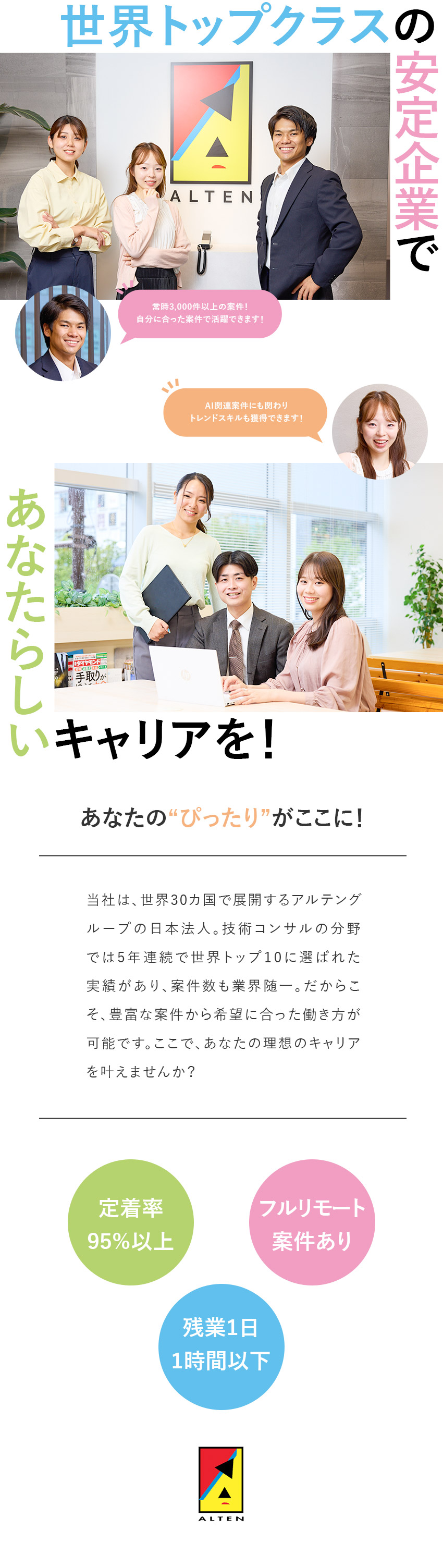アルテングループは、技術コンサルの分野では5年連続で世界トップ10(2020年~2024年)に選ばれた実績があり、世界的企業・大手国内企業から厚い信頼を集めています。(※)
