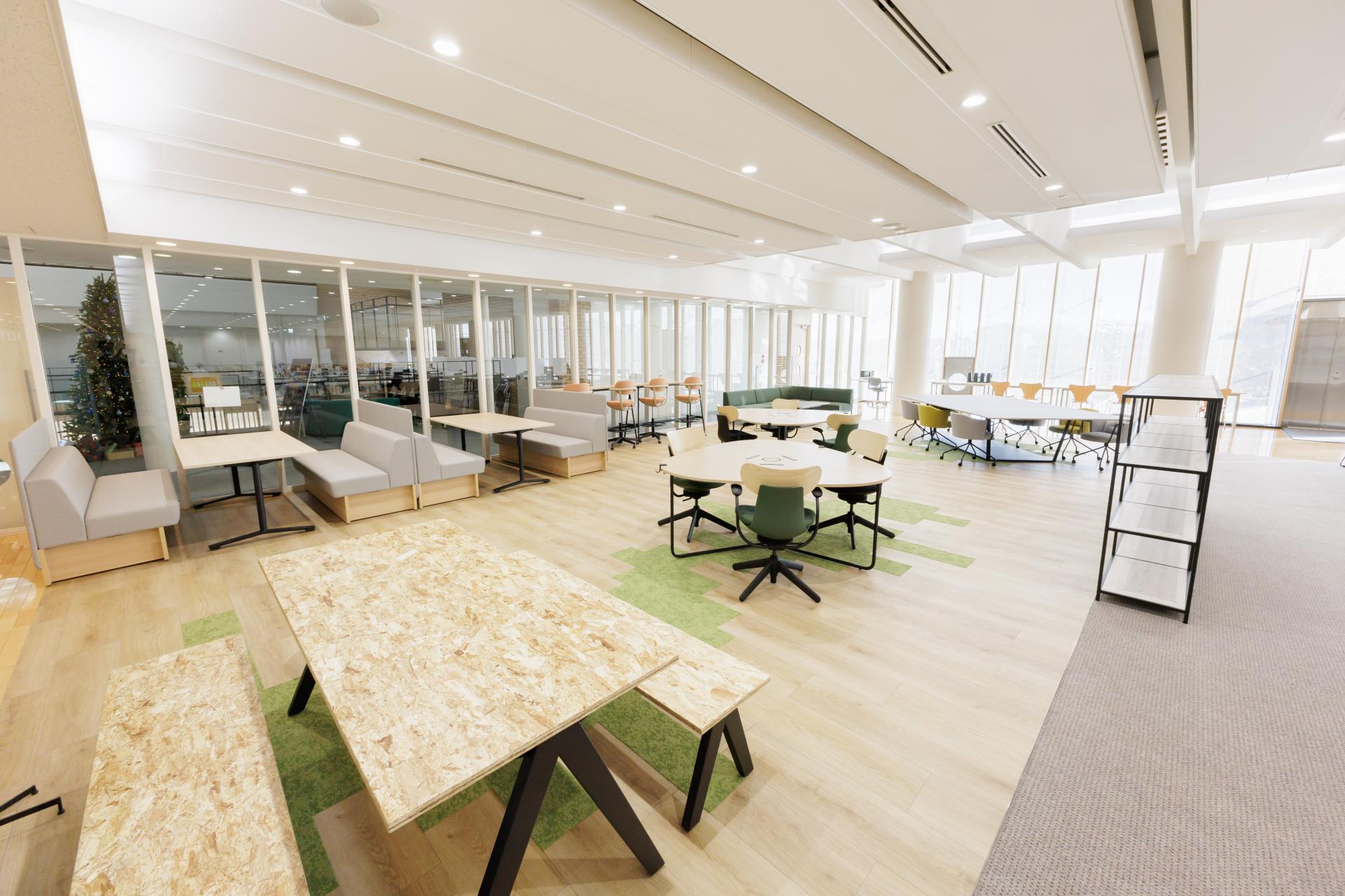 郊外のオフィスはとても広々としており、本社社屋前面には庭園が配置され内部も吹き抜け構造になっていて開放感があります。