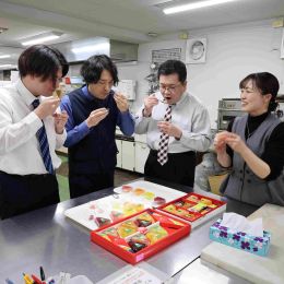 商品の試食風景です。研究室のような快適な働き方が実現可能。助け合う風習できっとすぐに馴染めますよ。