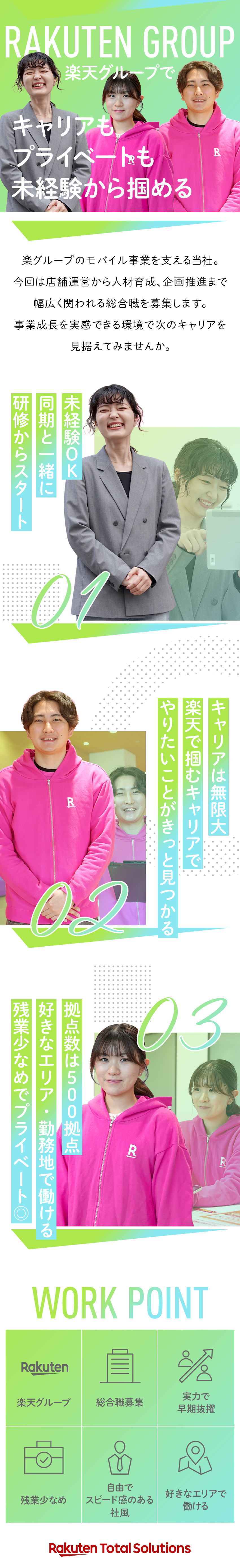 楽天モバイルは、2020年4月に本格サービス開始をした国内では新しい通信キャリアです。お客様やパートナー企業様をはじめとする多くのご支援により、短期間で契約数が1,000万回線に到達するなど成長を続けています。新規店舗が続々増え続けており、新たなポジションも多数生まれています。その中核となる人材採用となります。