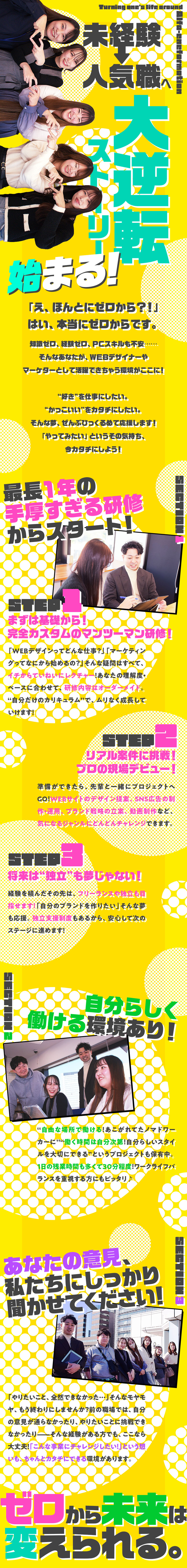 WEBやSNSを活用した情報発信の需要は年々拡大中。とはいえ、業界は経験者優遇の傾向が強いのも事実です。だからこそ私たちは、未経験の方でも「やってみたい」という気持ちを大切にし、一歩を踏み出せる環境を整備。これからも「挑戦できるチャンスは、誰にでもある」そんな会社であり続けたいと考えています。