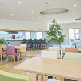 グリーンや木目を基調とした明るいラウンジ。毎週月曜のお弁当提供日には全員で集い、一緒に食べています。