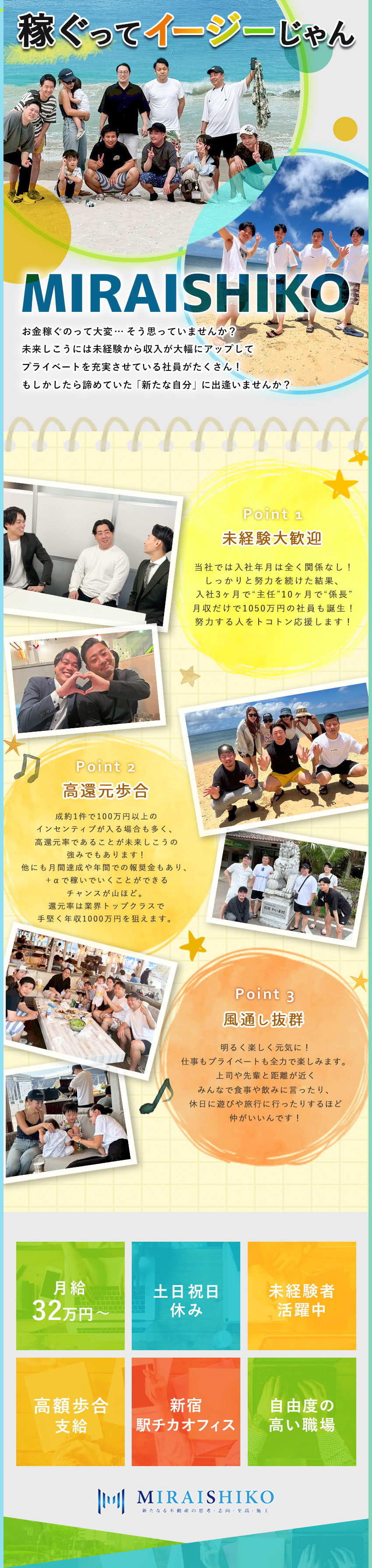 社員から「初めて家族4人、沖縄旅行に行きました」、「最初の歩合でブランド財布を親にプレゼントしました」など、これまでに出来なかったことが当社で実現し、やれることが増えたことによる『社員の笑顔』が私のモチベーションです。
