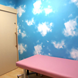 処置室の中には、青空や森のあしらい。目を奪われているうちに、診察は終わっています。