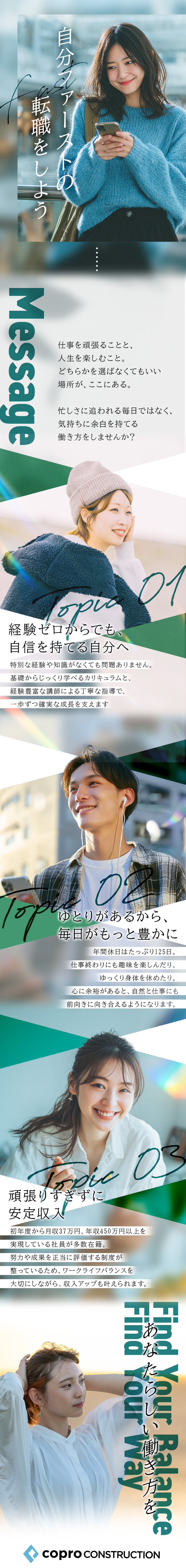 前職では収入が不安定で、将来が見えないことが不安でした。コプロに入社してからは、収入が安定し、休日も増えたことで生活に余裕が生まれました。平日でも趣味の時間を楽しめるのはありがたいです。