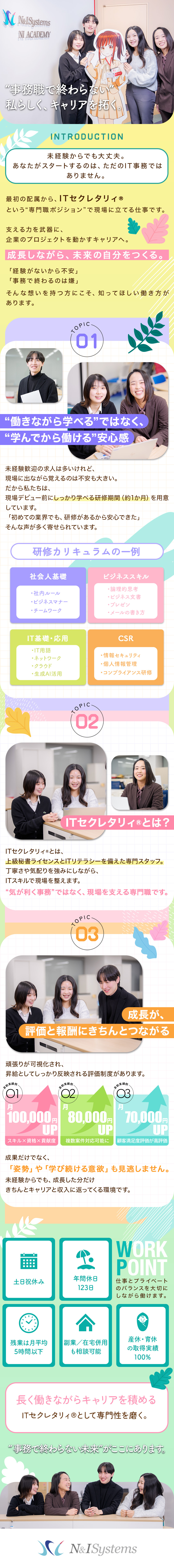 印象的だったのは、未経験でも最初からITセクレタリィとしてスタートできる点。約1か月の研修でビジネス基礎やIT知識を学んでから配属されるため、不安なく挑戦できるそうです。