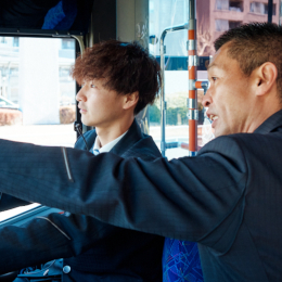 営業所でリーダーが同乗し実地で研修を行い、路線の特性や地域情報をマスター。目安は1路線教習で1カ月程度ですが、一人ひとりの習熟度に応じて、研修期間を柔軟に延長することが可能です。