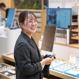 「お客様の使用シーンや目的をお伺いし、その方の雰囲気やファッションに合ったメガネをご提案します。商品の性質上、『似合う』だけでなく、メガネとしての機能性も重要です。豊富な商品ラインナップから、機能性とファッション性の両方にご満足いただける、最適な一本を見つけることが私たちの腕の見せ所です。また、『このメガネをかけることで、よく見えるようになった。自分の印象がこんなふうに変わった』といったお客様の変化を一緒に実感できるのも、この仕事の大きなやりがいです。」