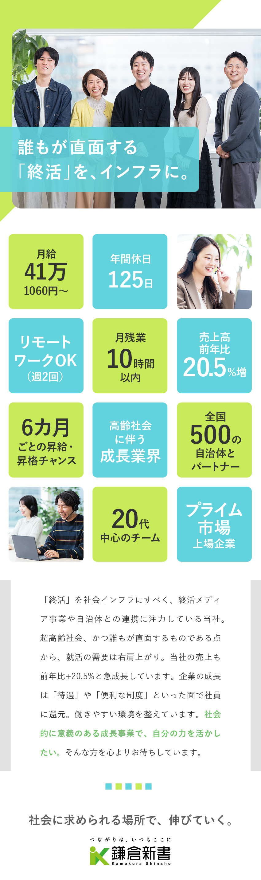 【東京】営業マネージャー候補◆プライム上場・IT×終活/業界未経験歓迎/在宅可/年125日休