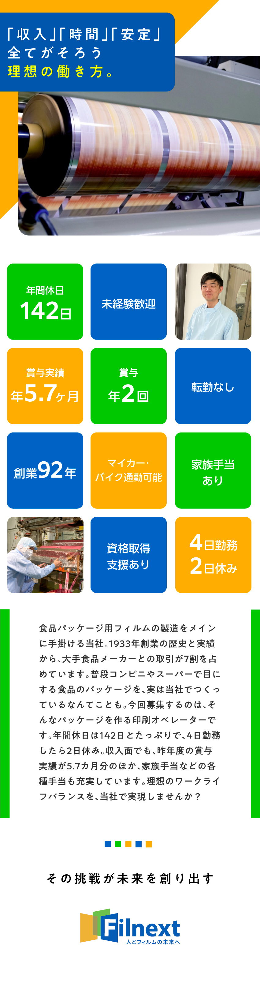 ラミネートオペレーター/未経験歓迎/年休142日/4勤2休