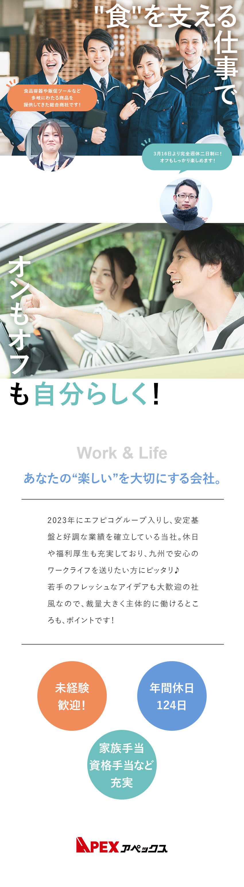 食品容器や販促ツールなど、日常に欠かせない「食」を支える商品を通じて、多くのお客様の役に立てる仕事です。長くお付き合いのある取引先も多く、信頼関係を築きながら提案できる点も魅力。地域に根ざした安定した環境で、着実に成長を実感できます。