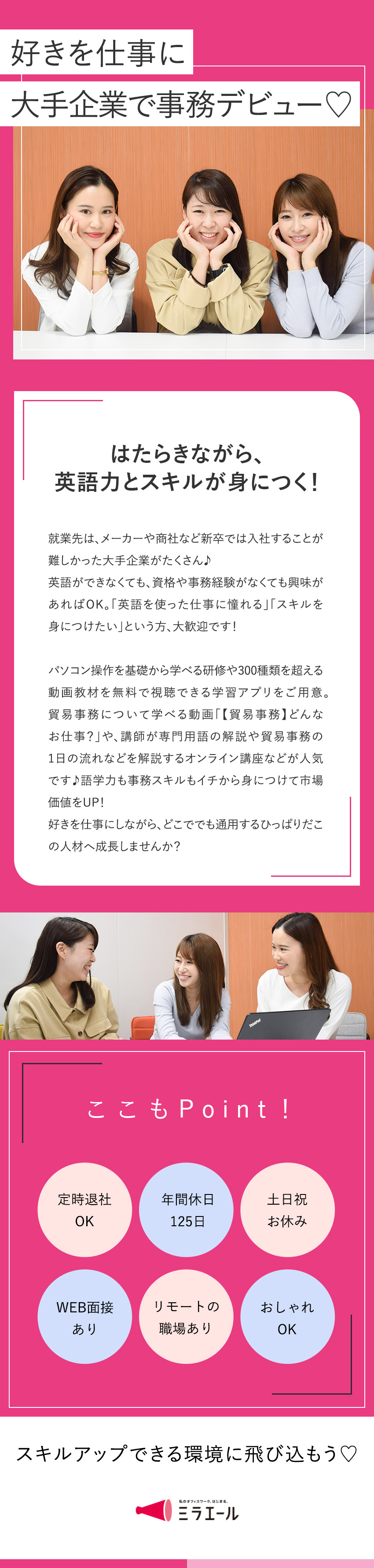 英語が学べる貿易事務/20代女性活躍中/在宅有/土日祝休