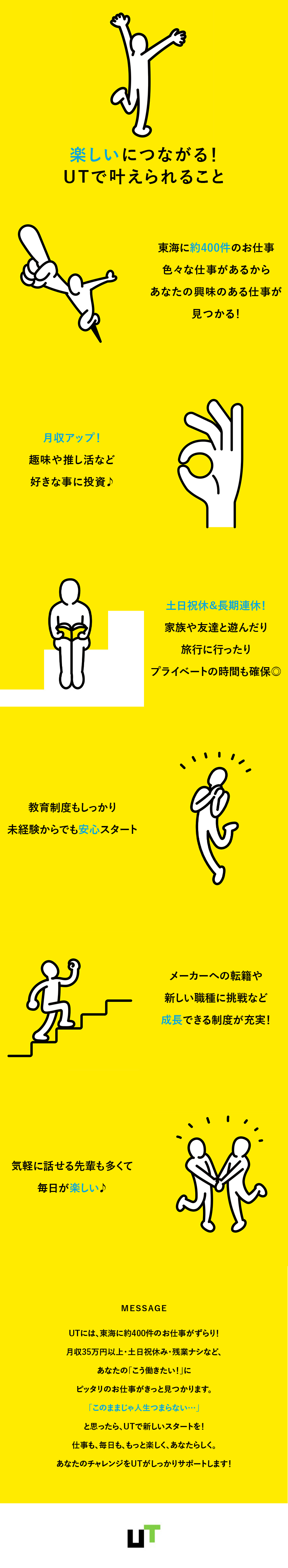 仕事が合うかどうかは働いてみないとわからないものですが、多種多様な働き方ができるUTならば、きっとあなたらしい働き方を見つけられるはずです。