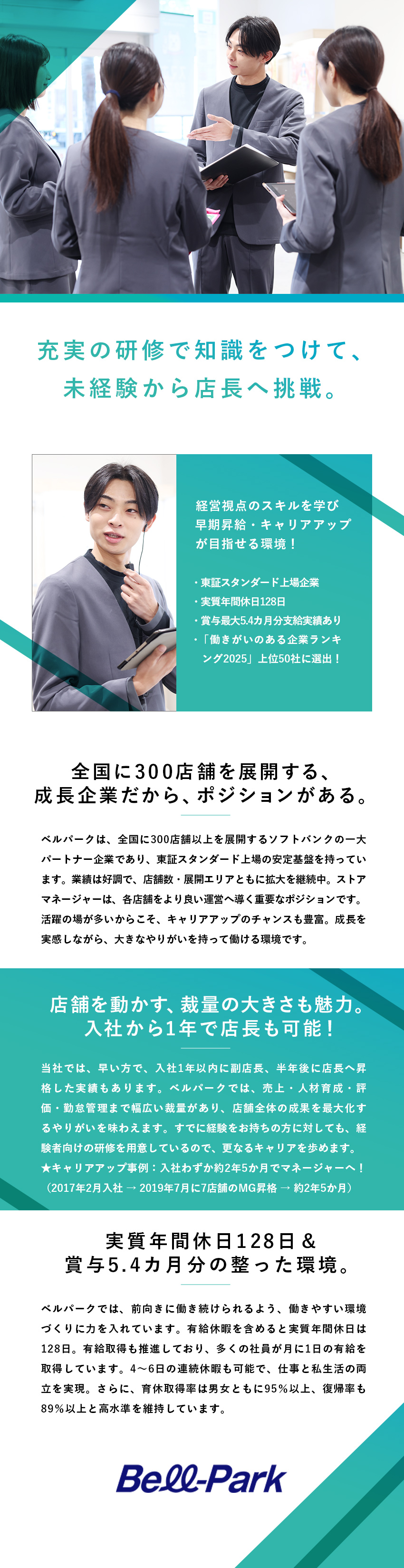 ですが、ベルパークの特徴の一つとして、未経験スタートでも早期年収UPや早いうちからマネジメント経験を積む社員も少なくありません。店舗スタッフ・店長にとどまらないその先のキャリアを描ける場所です。そのため、「先のキャリアが描きづらい」「若いうちに責任ある仕事に挑戦したい」。このような想いを抱いている方にとって、今回の募集はまたとないチャンスとなるでしょう。